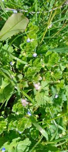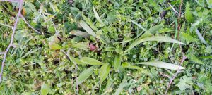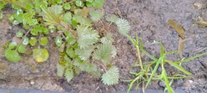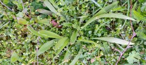 Spitzwegerich hat längere spitze Blätter (hier u.a. mit Vogelmiere zusammen). Er ist Schleimlösend und kann uns Menschen zerrieben auf der Haut den Juckreiz der Insektenstiche mildern.
